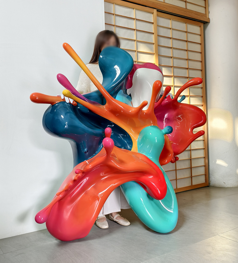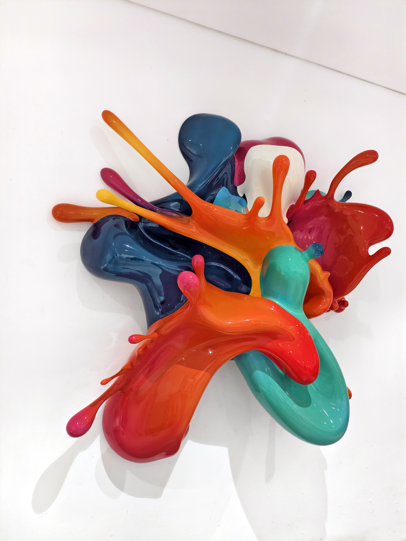 A wall-mounted sculpture that freezes a moment of liquid motion, where glossy paint appears to collide in mid-air.