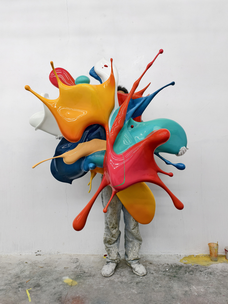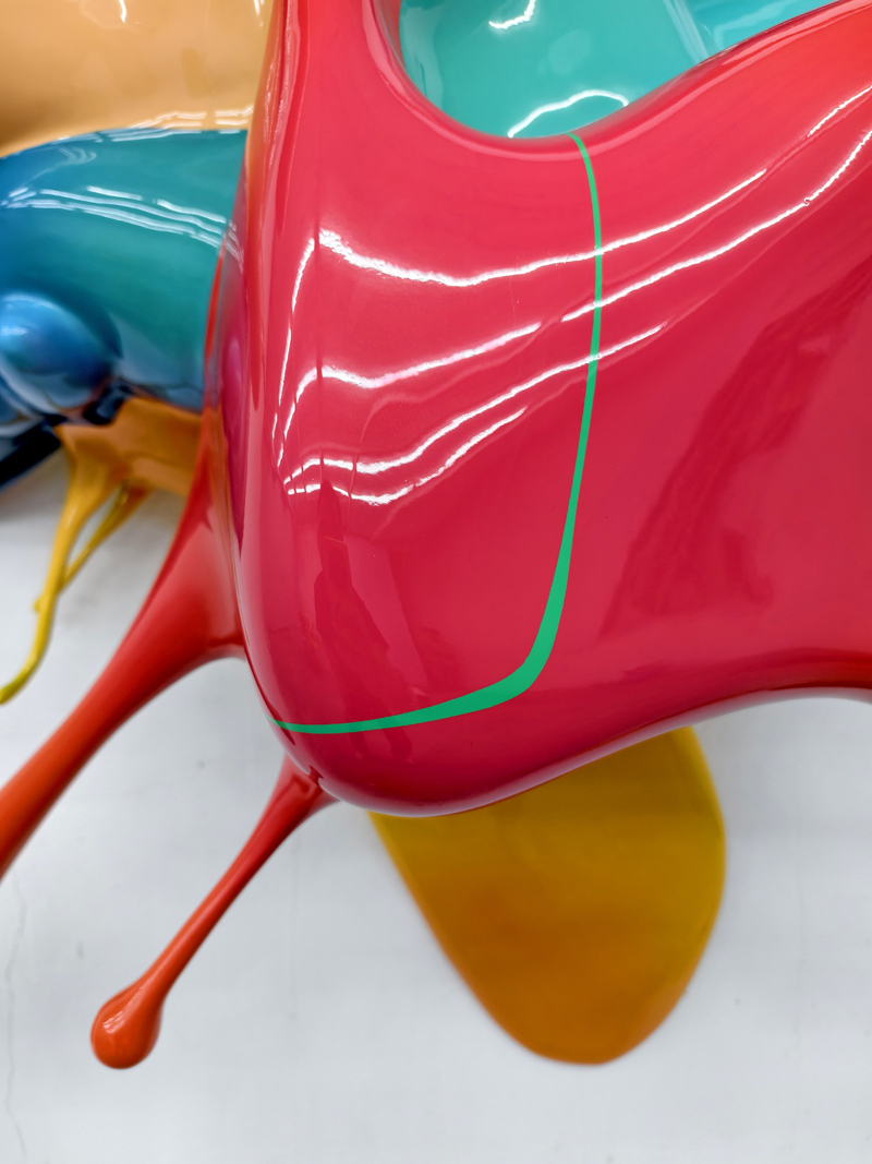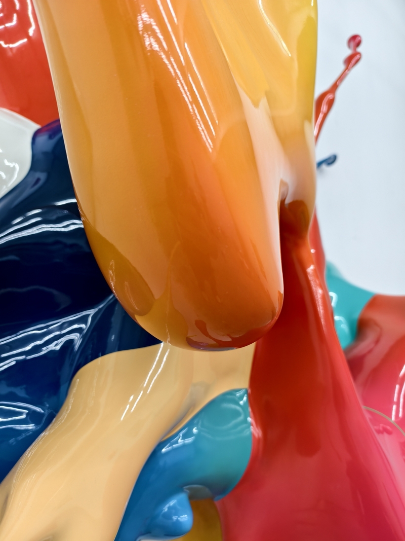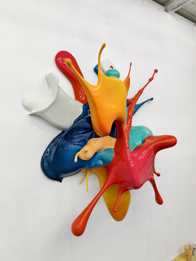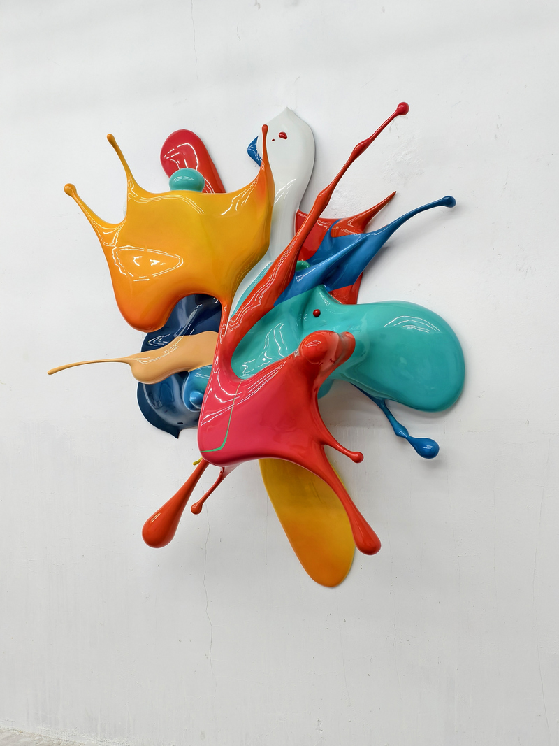 A wall-mounted sculpture that freezes a moment of liquid motion, where glossy paint appears to collide in mid-air.