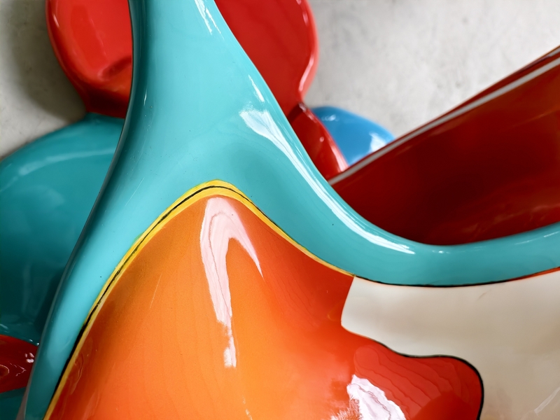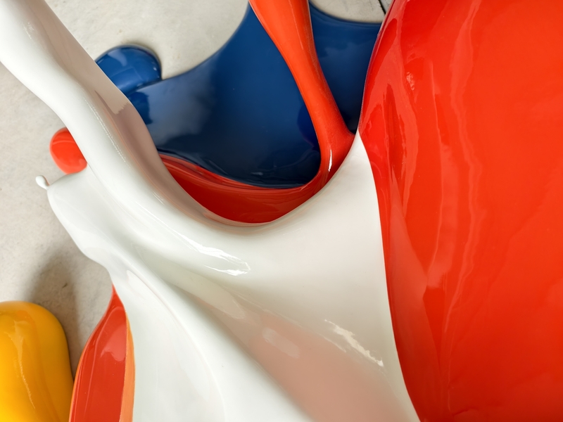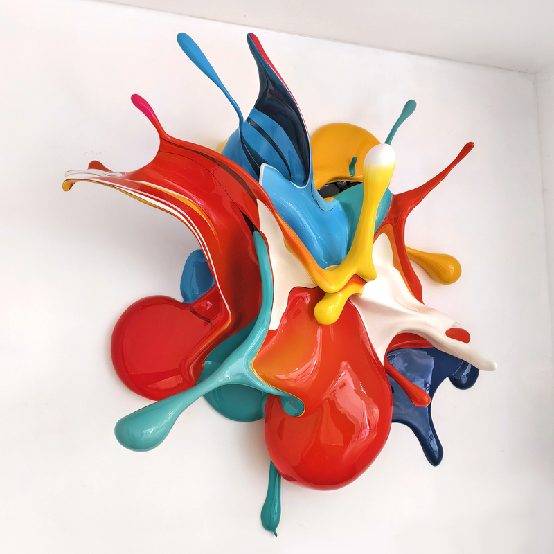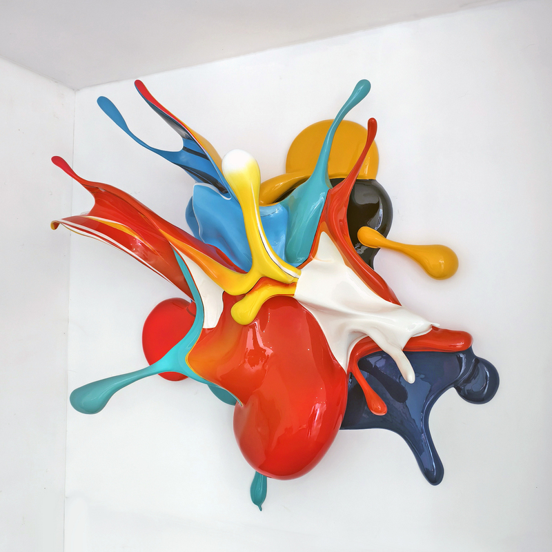 A wall-mounted sculpture that freezes a moment of liquid motion, where glossy paint appears to collide in mid-air.