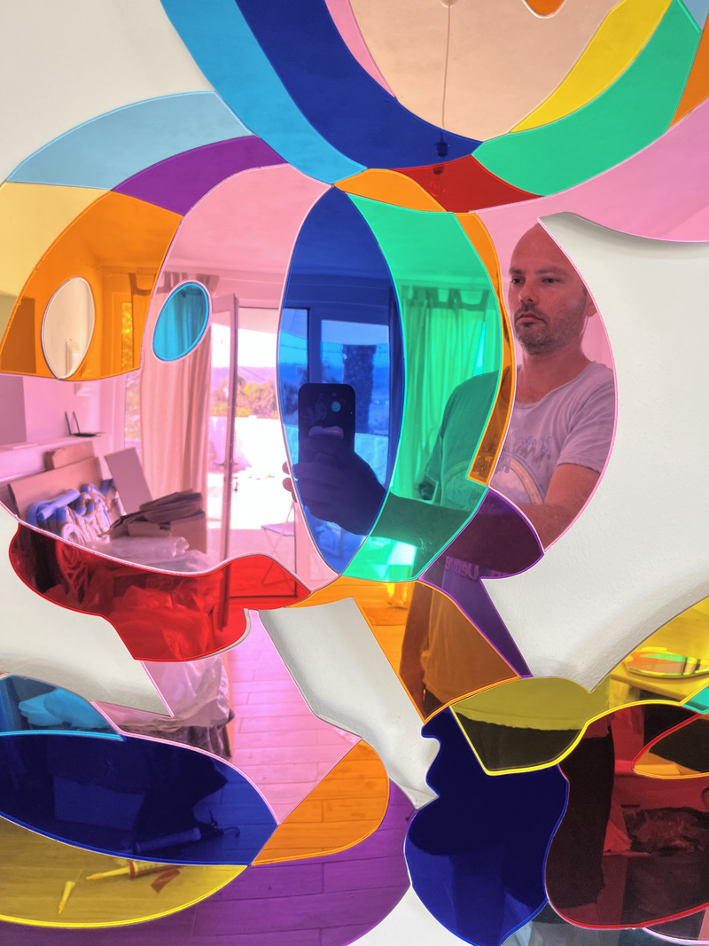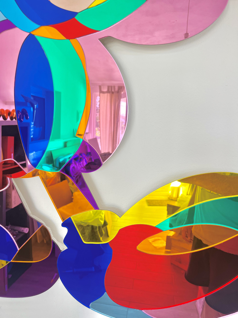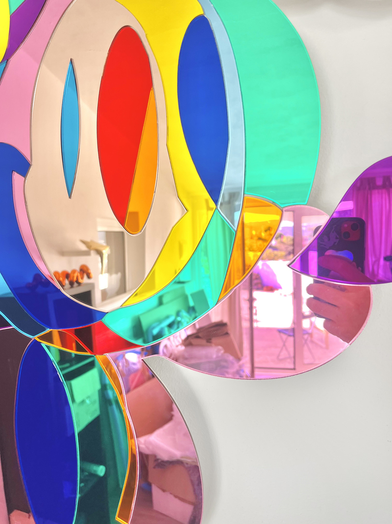 As a child in the 1980s, I was fascinated by Mickey Mouse, collecting his images from magazines. Today, I continue to play with this iconic figure, reimagining him in bold, punchy graphics. I use colourful mirrored surfaces to heighten the image’s vibrancy and invite viewers to see themselves within it — keeping Mickey both recognisable and joyfully alive.